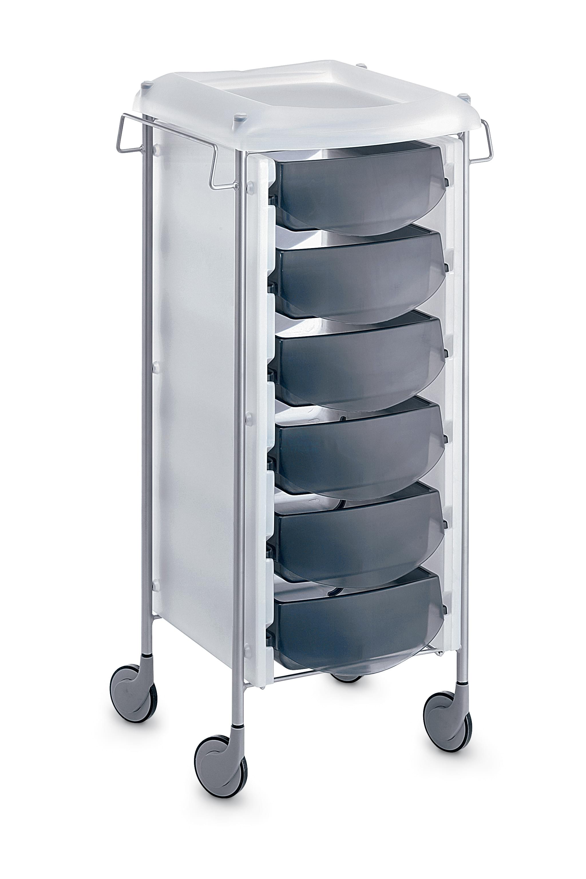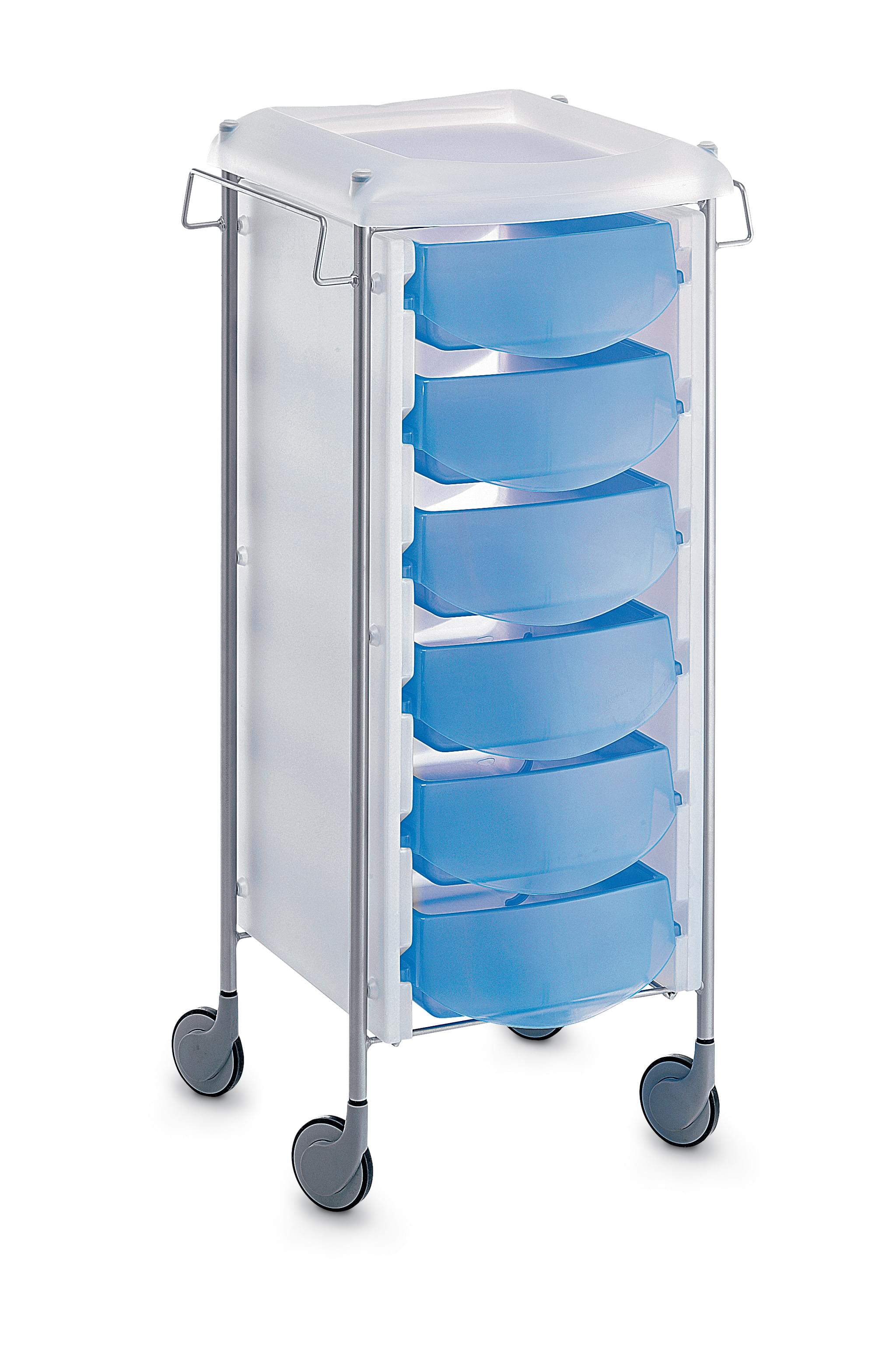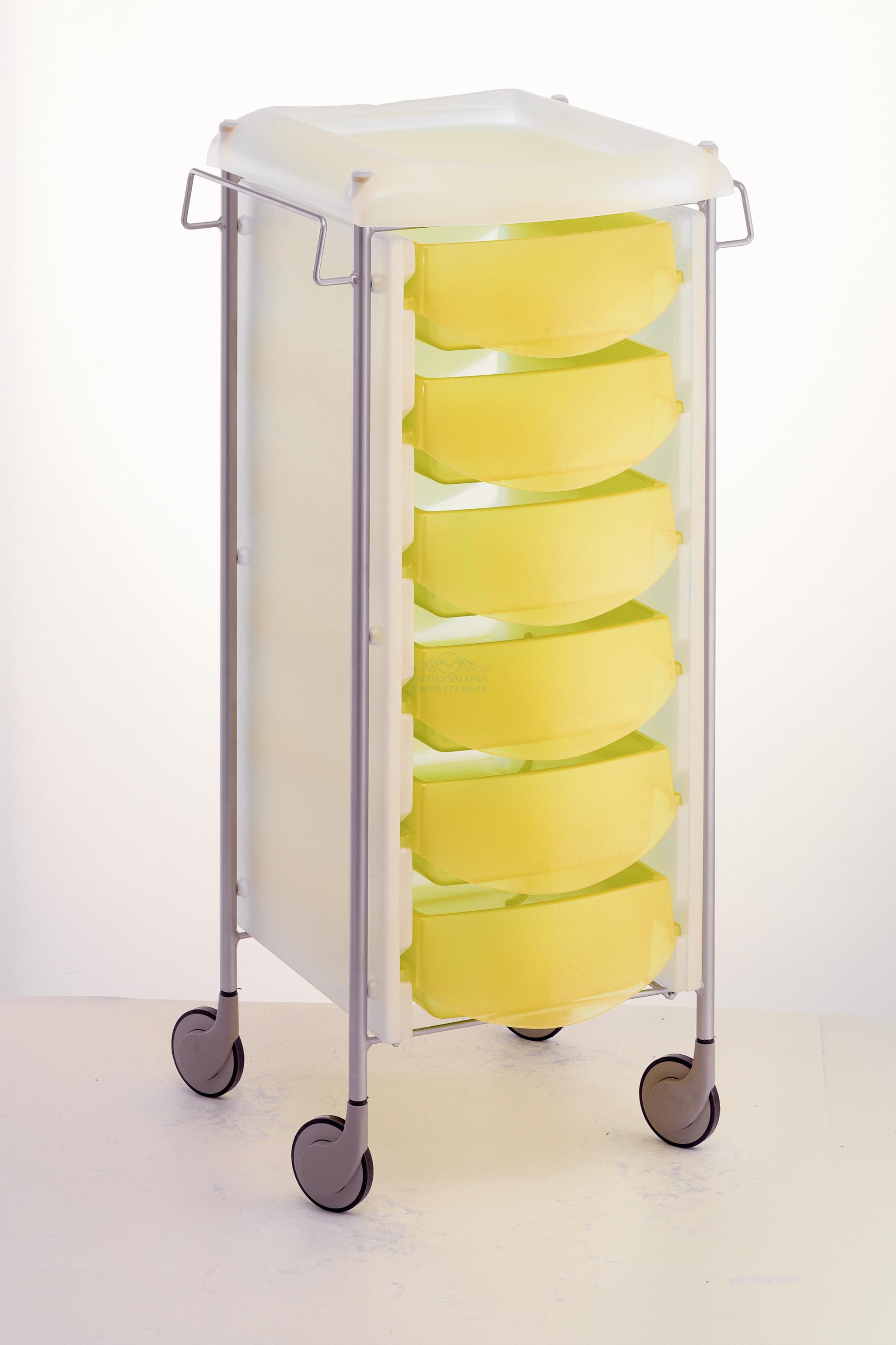 Тележка парикмахерская выполнена из пластика, на колесиках, с выдвижными ящиками. Цвет: прозрачно-белый с серыми, голубыми, желтыми или розовыми ящиками. Размер (ДхШхВ): 44х41х93