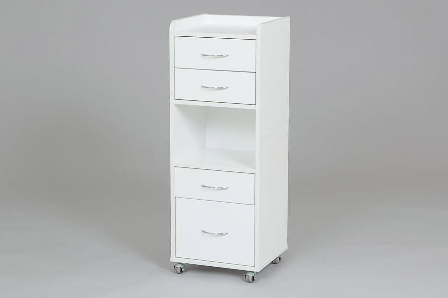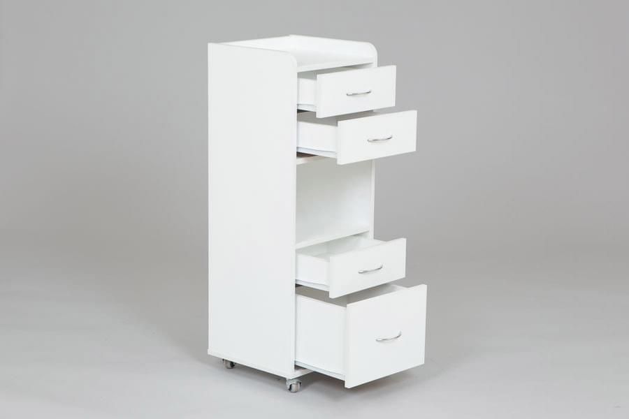 Косметологическая тележка ТК-3 изготовлена из практичного и прочного ЛДСП белого цвета. Изделие имеет четыре ящика различной высоты, что позволяет мастеру разместить инструменты и оборудование как малых, так и больших размеров. Верхняя полка оснащена бортиком, который предотвращает падение предметов при перемещении тележки.