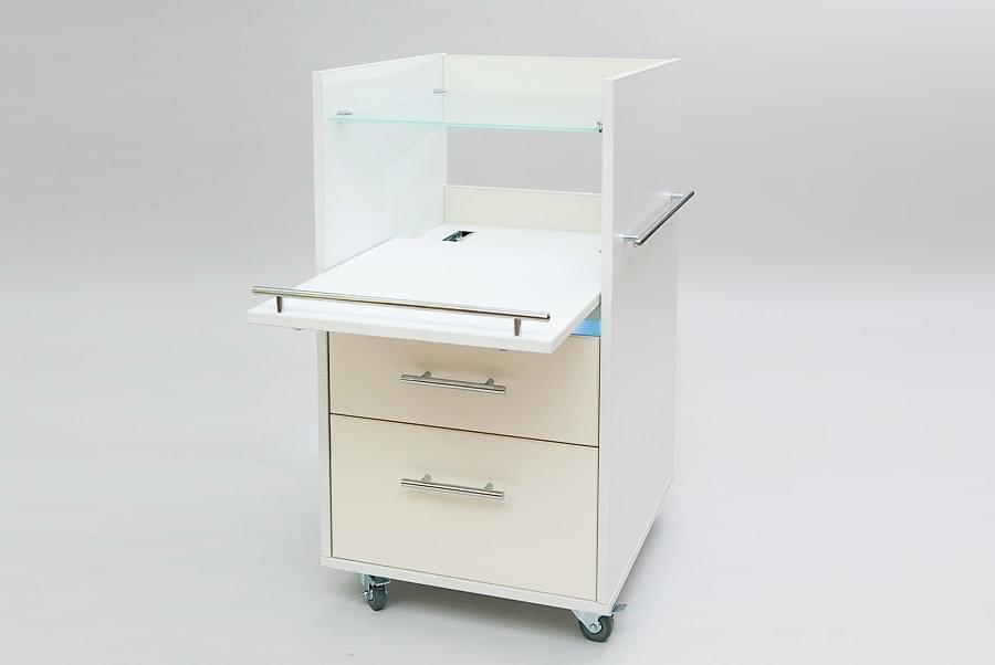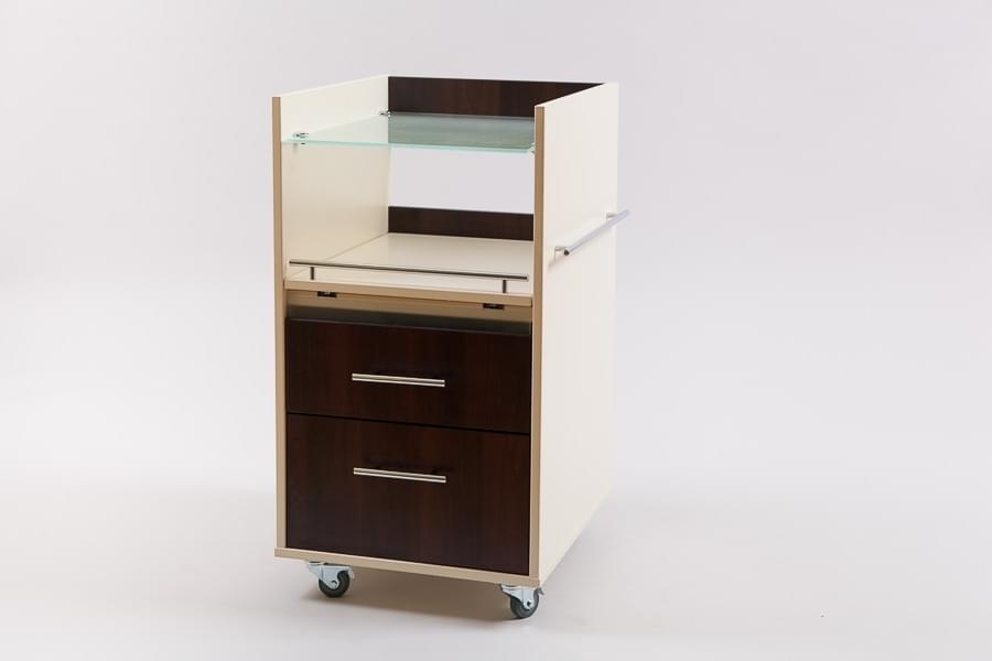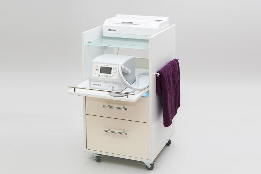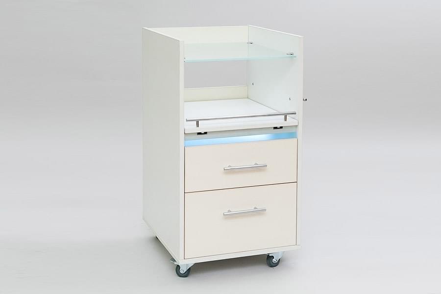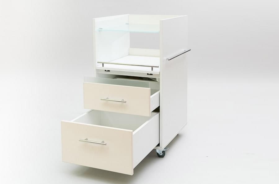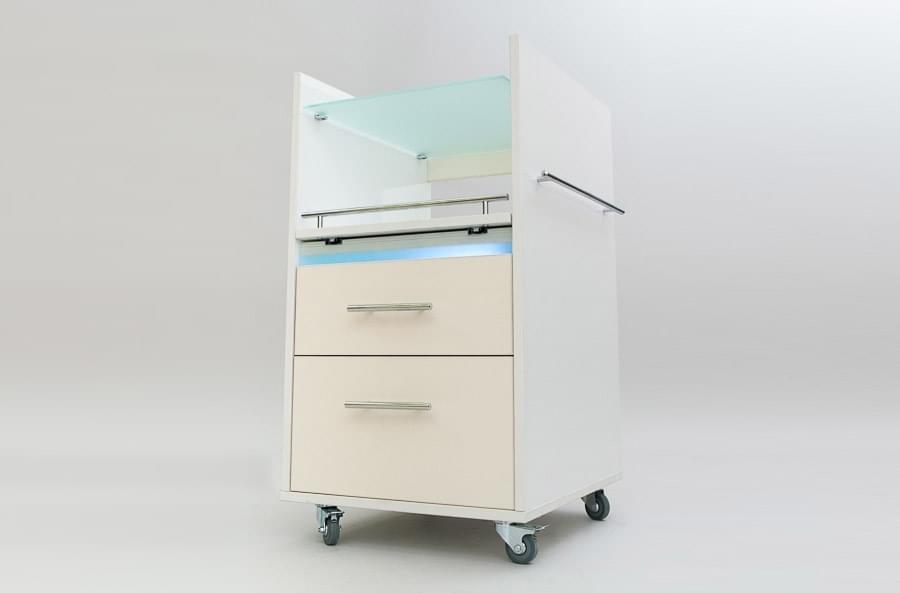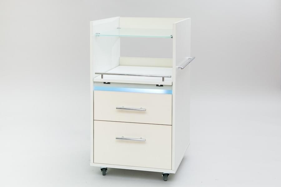 Компактная тележка Кубика является устойчивой, вместительной и многофункциональной моделью. Изделие имеет форму тумбы на колесиках с полувыдвижной полкой для аппаратуры, верхний ящик оснащен УФ-модулем с бактерицидной лампой для стерилизации инструментов. В ней вы сможете хранить необходимое для работы оборудование, сэкономив пространство кабинета и обустроив свое рабочее место под свои требования. Правая стенка тележки оснащена рейлингом для полотенец.