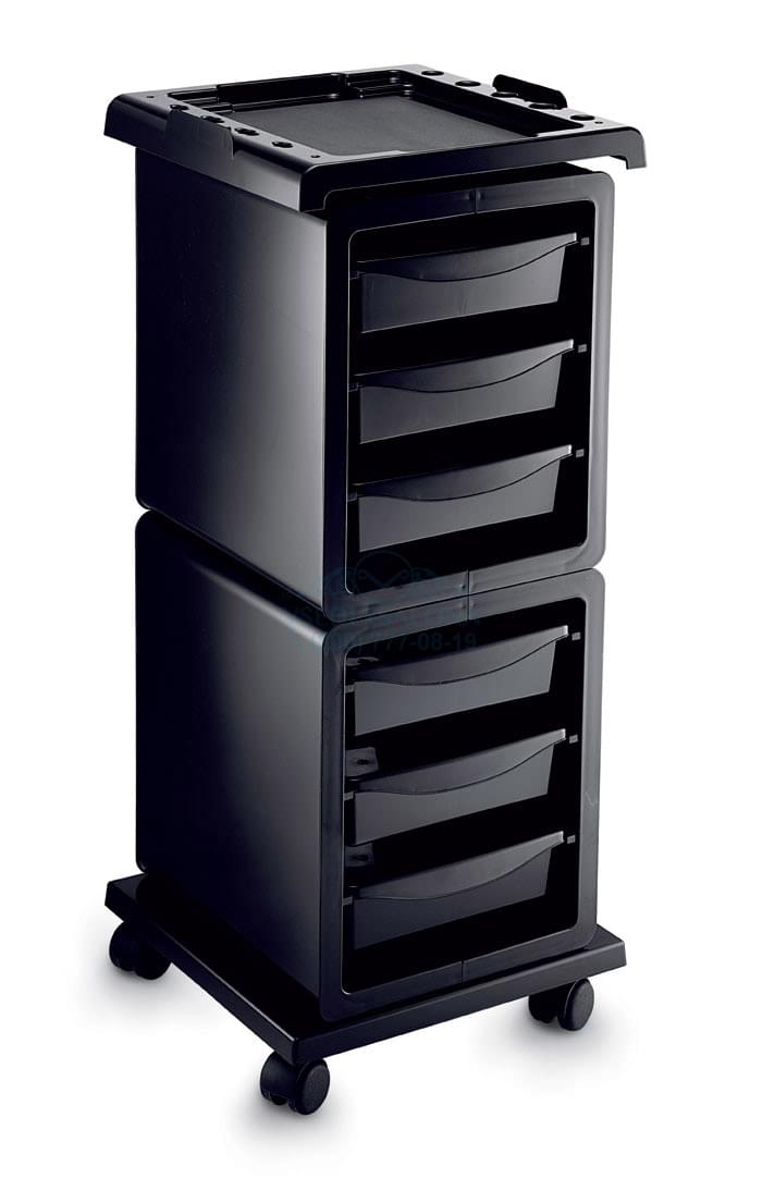 Тележка парикмахерская выполнена из пластика, на колесиках, с выдвижными ящиками. Цвет черный, белый, серый, красный. Размер (ДхШхВ): 38х38х9