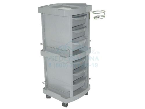 Парикмахерская тележка Т-30 оснащена глубокими и вместительными ящиками для парикмахерских принадлежностей, а также фенодержателем для еще большего удобства работы. Она выполнена в классическом черном цвете, что делает ее универсальной моделью практически для любой современной парикмахерской или барбершопа.