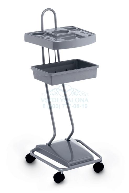 Тележка для краски, передвижная на колесах. С отверстиями для брашеров, углублениями для чаш, с одним яшиком. Материал - пластик. Цвет - серебро. Размер 38х36х96