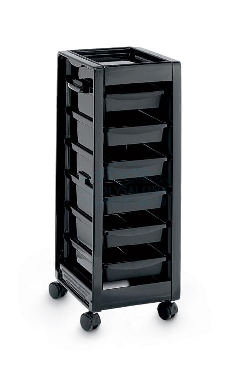 Парикмахерская тележка Т-30 оснащена глубокими и вместительными ящиками для парикмахерских принадлежностей, а также фенодержателем для еще большего удобства работы. Она выполнена в классическом черном цвете, что делает ее универсальной моделью практически для любой современной парикмахерской или барбершопа.