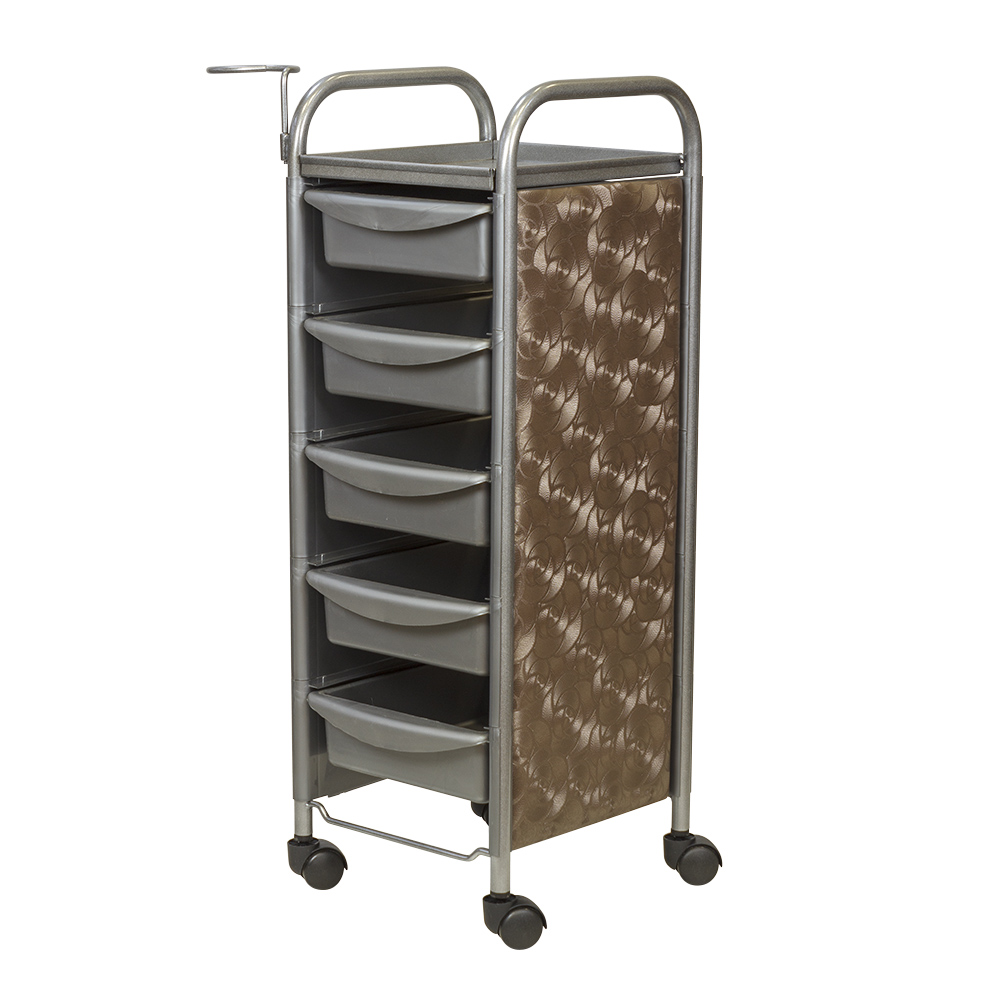 Для инструментов и расходных материалов в тележке предусмотрены пять съемных ящиков. На верхней полке можно разложить инструменты, используемые во время процедур. Для быстрого и удобного перемещения по кабинету конструкция установлена на маневренные колесики. Практичное дополнение парикмахерского оборудования – фенодержатель.