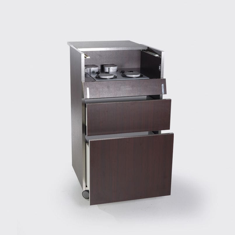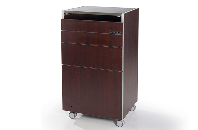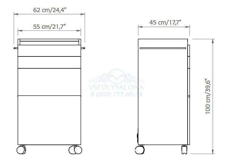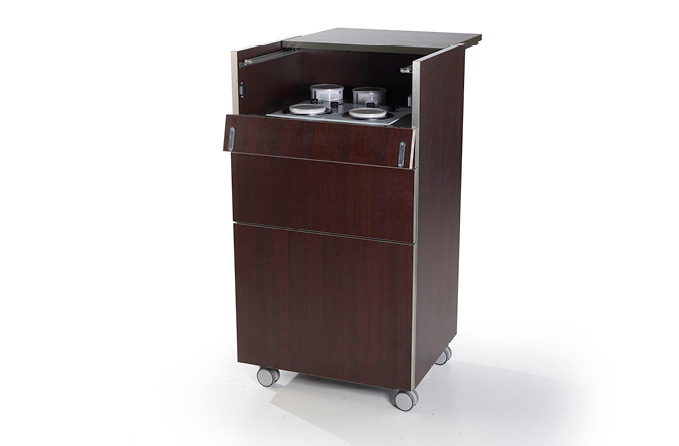 Элегантная тележка, спроектированная для процедуры депиляции. Снабжена ванночкой для воска, ящичком для инструментов и съемной корзинкой – что делает рабочую среду более практичной для персонала.