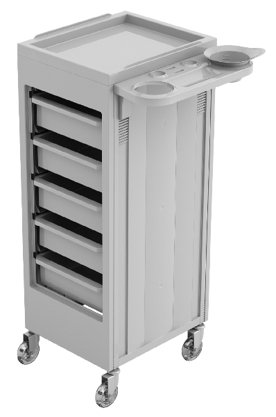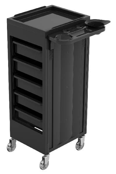 Тележка парикмахерская "CHARIOT A" - выполнена из пластика черного или белого цвета, на колесиках, с выдвижными ящиками открытого типа. Тележка с артикулом P - м60002093 оснащена удобной полкой с отверстиями для установки фена и чаши для окрашивания.