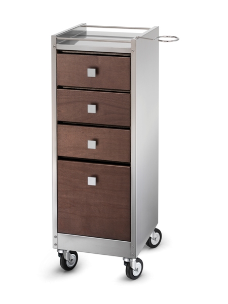 Тележка парикмахерская "GALAXY" - закрытого типа из нержавеющей стали оснащена тремя малыми выдвижными ящиками из дерева венге и одним большим выдвижным ящиком для размещения крупногабаритного инструмента. Две верхние рукоятки и четыре больших резиновых колеса облегчают перемещение тележки с артикулом A - м60002092