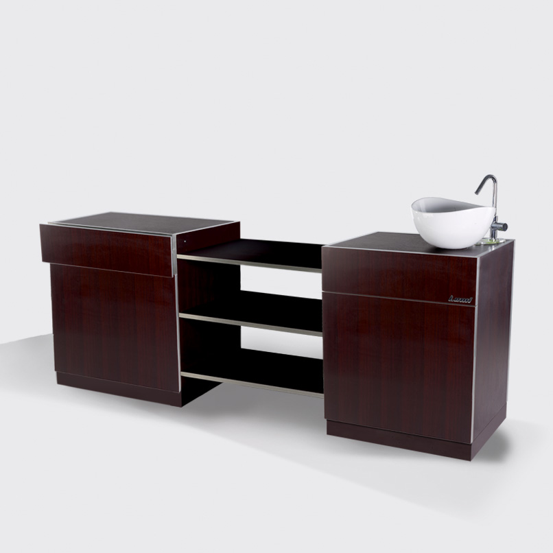 Администраторская стойка «Соната» сразу же привлекает к себе внимание. Каретная стяжка с мягкой текстурой выглядит современно и стильно, придает вашему заведению статуса и изысканности. Дополнительный эффект достигается за счет использования элегантных резных ножек, выступающих в роли некоего акцентного элемента. Со стороны администратора практически всю площадь занимают полочки и дверки, где можно разместить все для работы и личные вещи, если надобность в этом есть. Цвета отделки можно выбрать практически любые, что позволяет реализовать самые креативные идеи и придать вашей парикмахерской или салону красоты больше индивидуальности.