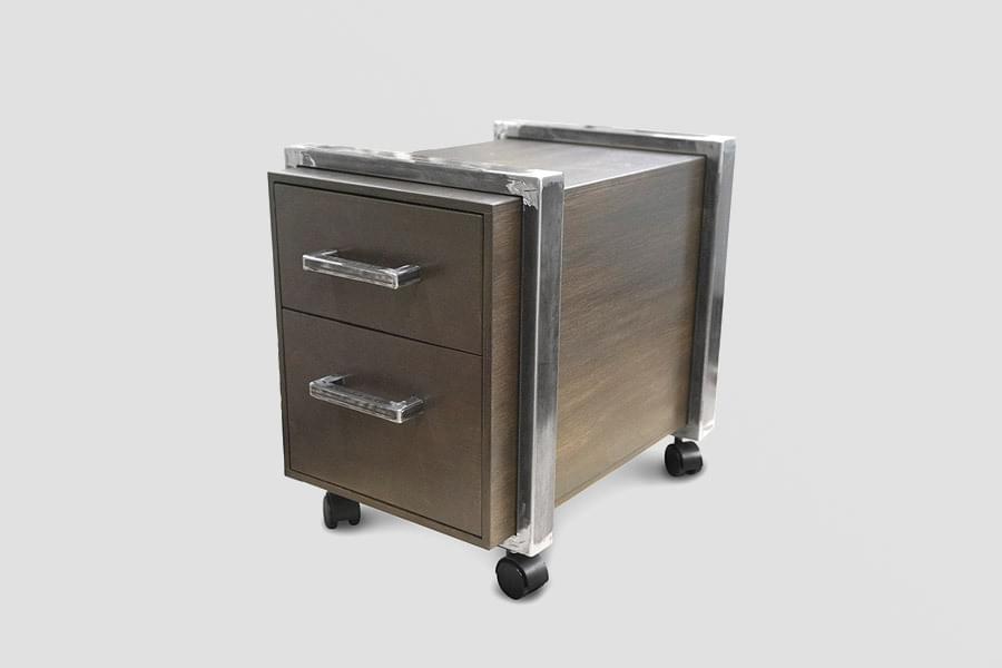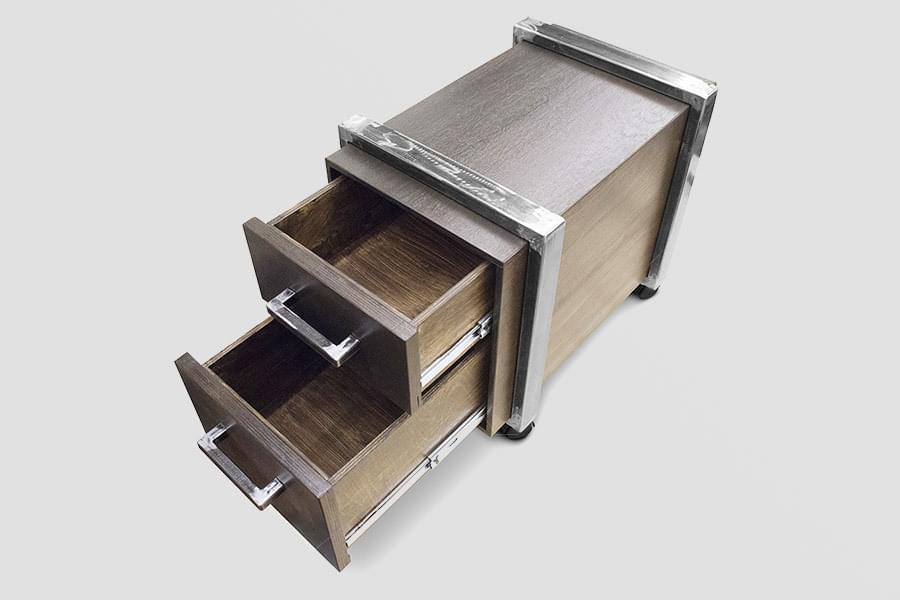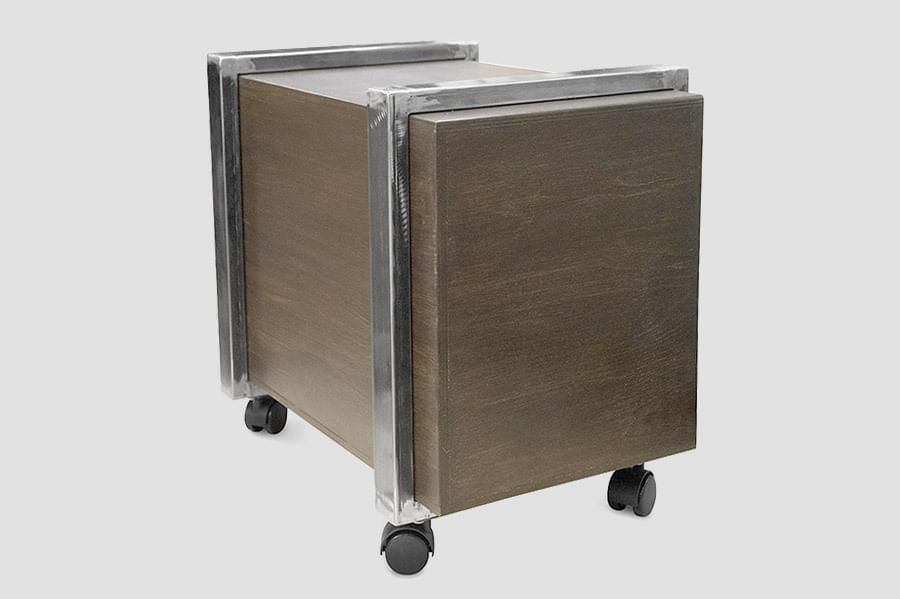 Корпус выполнен из искусственно состаренной фанеры со стальными обручами. Металл покрыт двухкомпонентным лаком, корпус и фасады ящиков тонированы по собственной технологии, сверху изделие покрыто лаком на водной основе. Использованы фирменные ручки. Ящики на направляющих полностью выдвигаются, глубина ящика - 400 мм. Колеса прорезиненного типа, с тормозом.