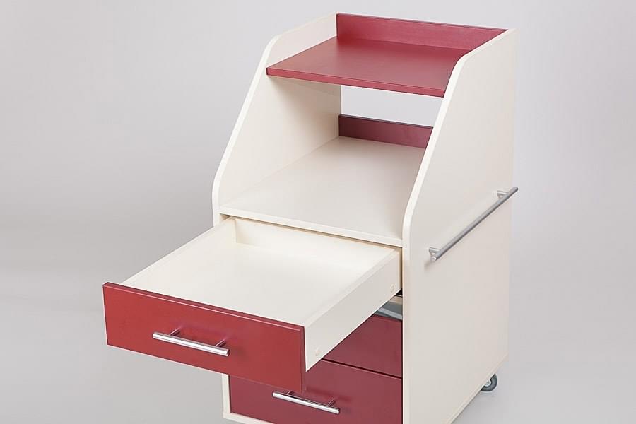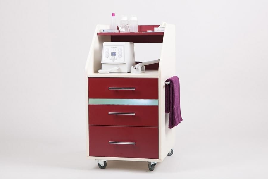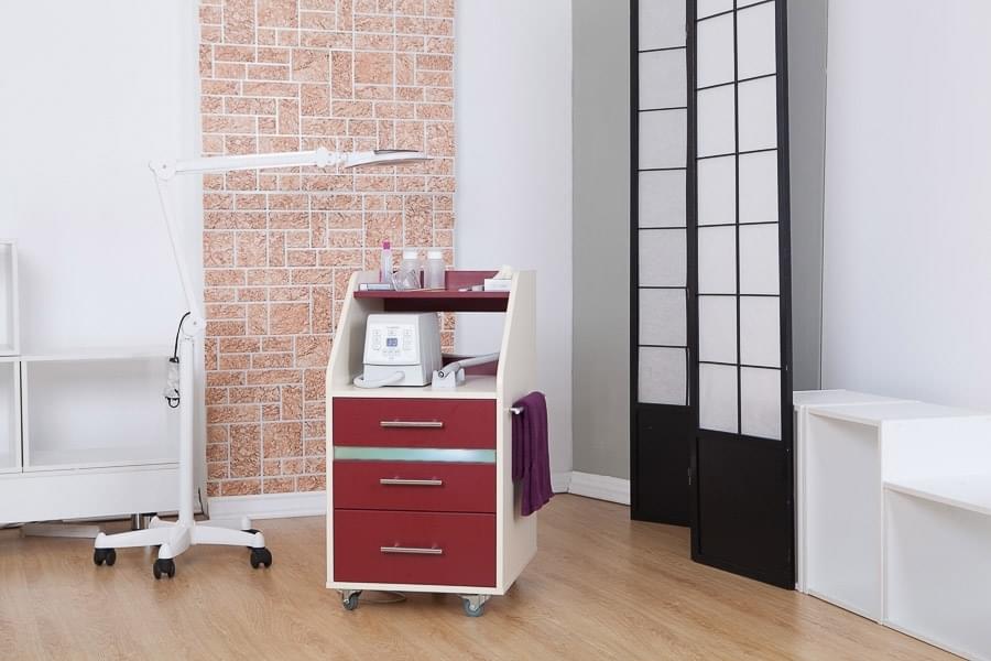 Косметологическая тележка Атика имеет три выдвижных ящика, средний оснащен УФ-модулем с бактерицидной лампой стерилизации инструментов. На правой стенке размещен рейлинг для полотенец. Наверху имеются две открытые полки, где можно разместить косметологическое оборудование и аппаратуру.