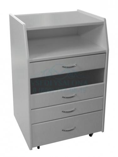 Тумба для кабинета педикюра и косметологии, изготовлена из окрашенного МДФ, с одной полкой и четыремя выдвижными ящиками, одна из которых оснащена УФ-лампой, мощностью 8 Ватт. Цвет: Матовый белый.