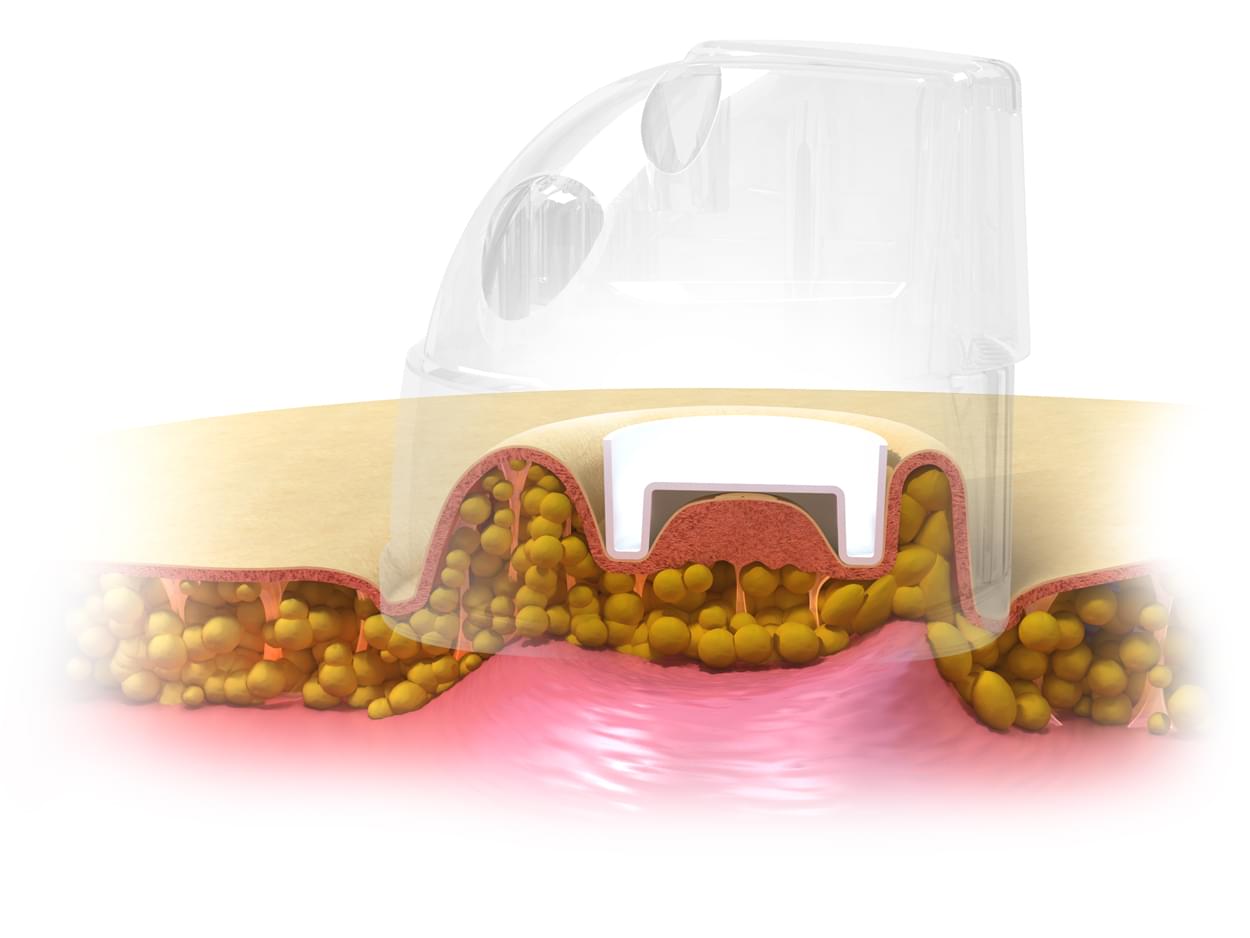 Запатентованная насадка "EVO3D" - единственная вакуумно-роликовая манипула, создающая двойную кожную складку. В состав манипулы входят три ролика: два шестигранных ролика по переферии обеспечивают дополнительный микромассаж при движении, гладкий ролик, расположенный эксцентрично, создает двойную кожную складку и препятствует перерастяжению кожной складки, что делает процедуру комфортной, безболезненной и максимально эффективной.