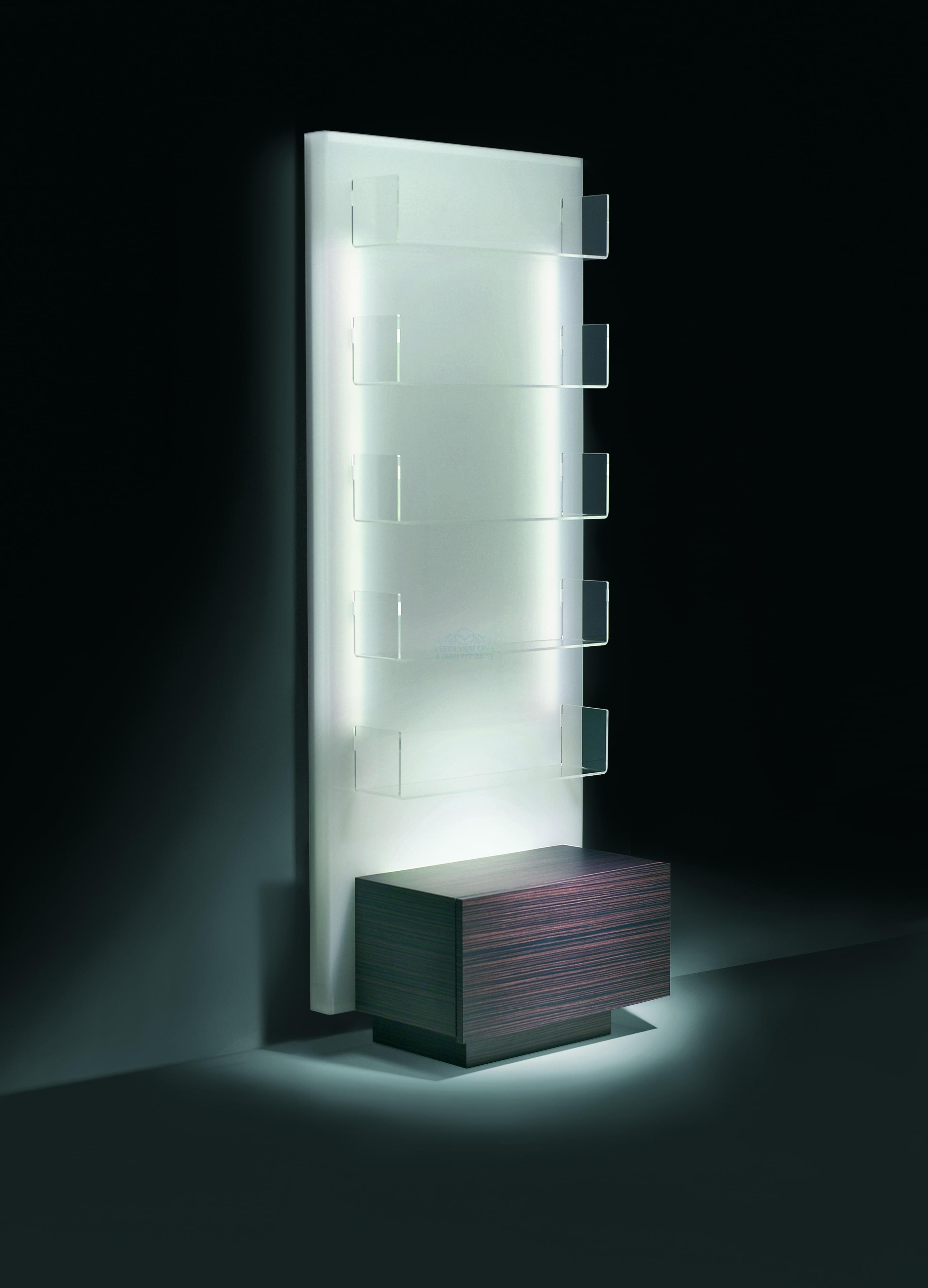 Акриловая витрина с подсветкой. 5 полочек, цвет белый. С деревянным коробом.