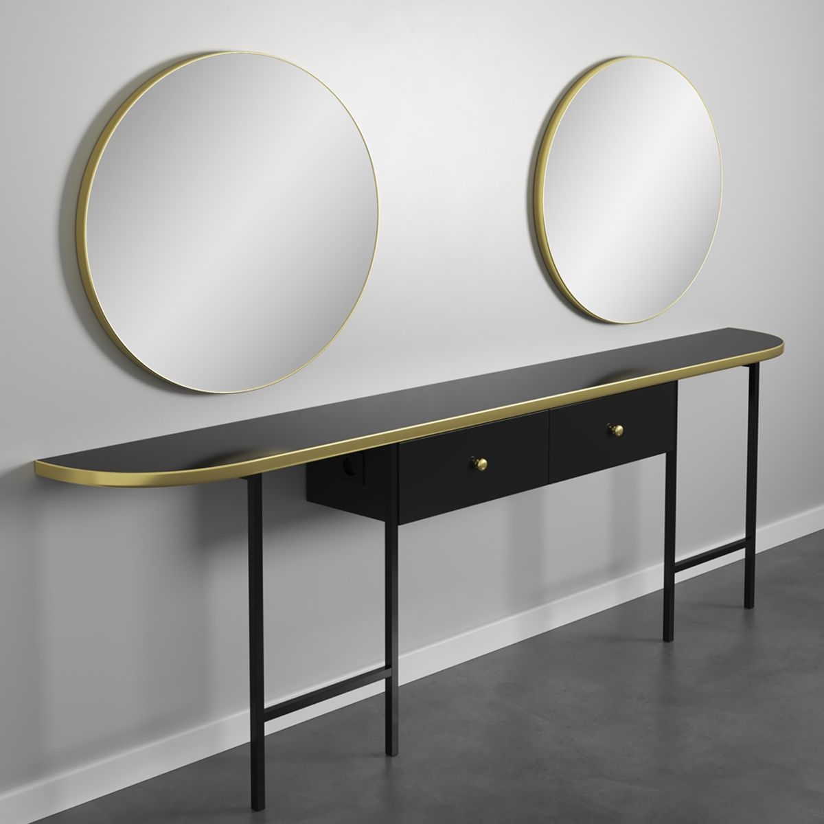 Зеркало парикмахерское "Betelgeuse Wall" - рамы из блестящего черного или золотого цвета. Круглое зеркало. Черная металлическая конструкция с черной верхней частью.