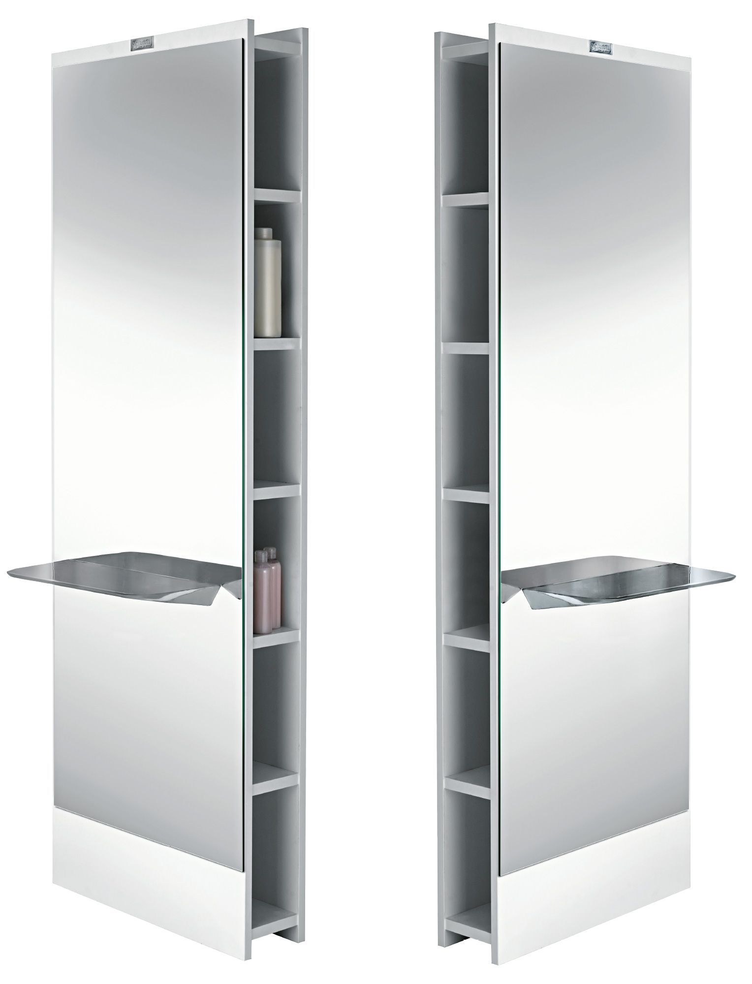 Зеркало парикмахерское одностороннее крепление к стене, с открытыми секциями. Каркас выполнен из ламината белого цвета, хромированная столешница. Возможен вариант изготовления в ламинате других цветов.