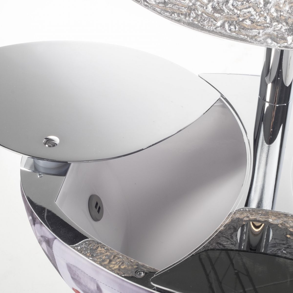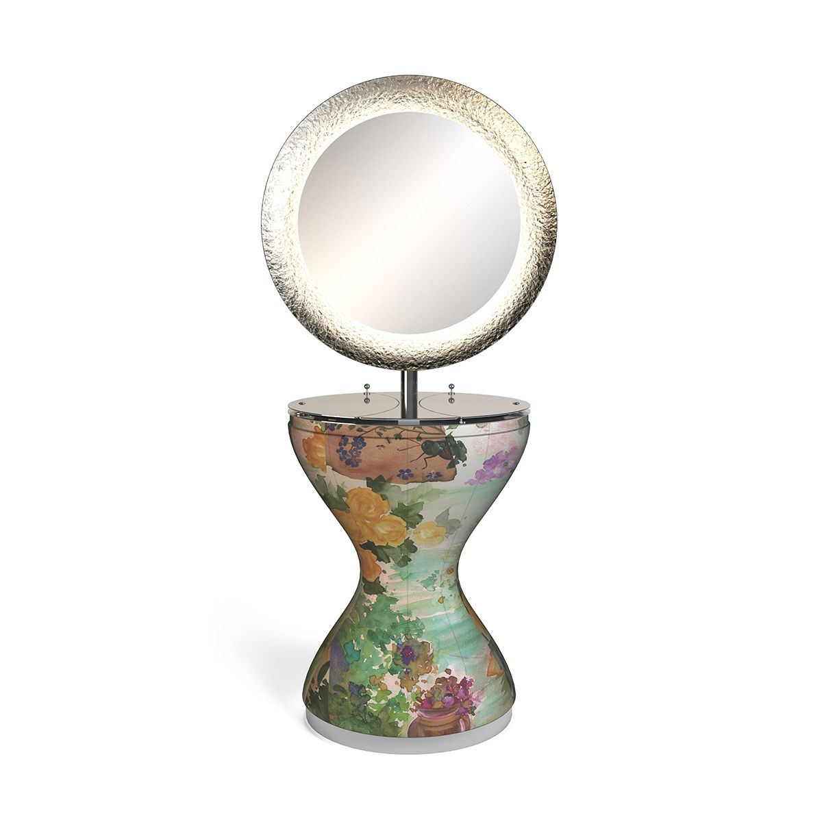 Зеркало парикмахерское "Miss Beauty" - со съемной тканевой обшивкой, круглым зеркалом с изогнутым назад элементом, отделанным листовым серебром. Светодиодная подсветка, электрическая розетка / USB-порт, двойной ящик для инструментов, выдвижной держатель для фена.