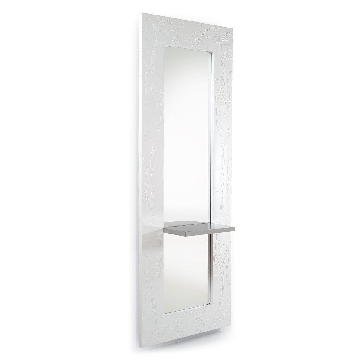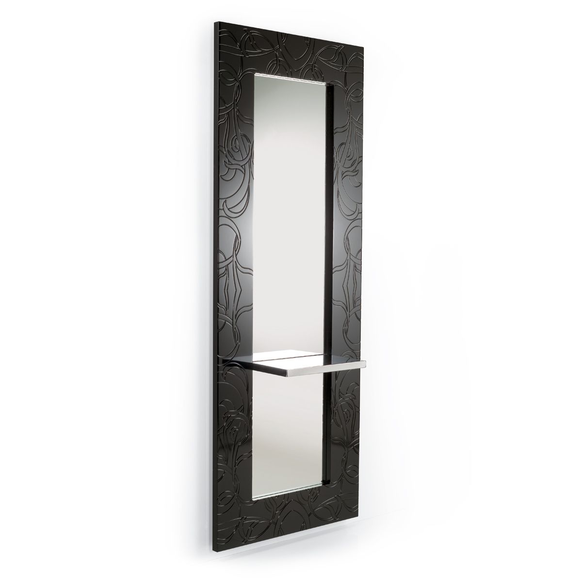 Зеркало парикмахерское "Parlor Wall" - с декоративной рамкой. Рама зеркала выполнена из глянцевого акрила черного или белого цвета с рисунком. Зеркало оснащено металлической хромированной столешницей. Крепление к стене.