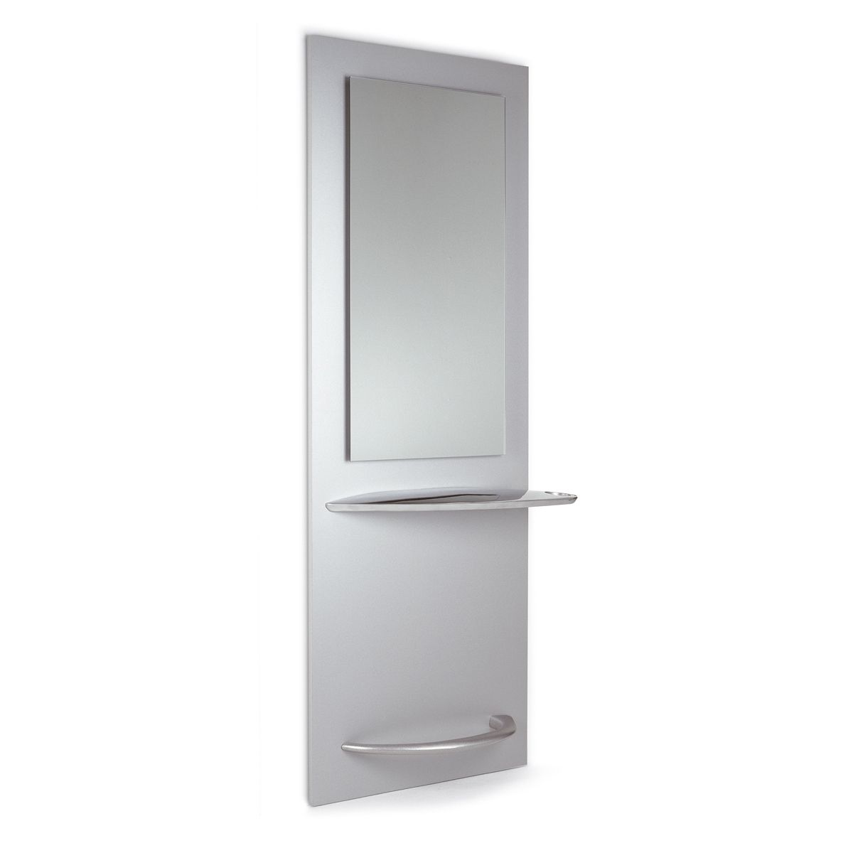 Зеркало парикмахерское "Sanbo" - прямоугольной формы. Каркас зеркала выполнен в меламине. Зеркало оснащено алюминиевой столешницей оригинальной формы с отверстием для фена и подставкой под ноги. Крепление к стене.
