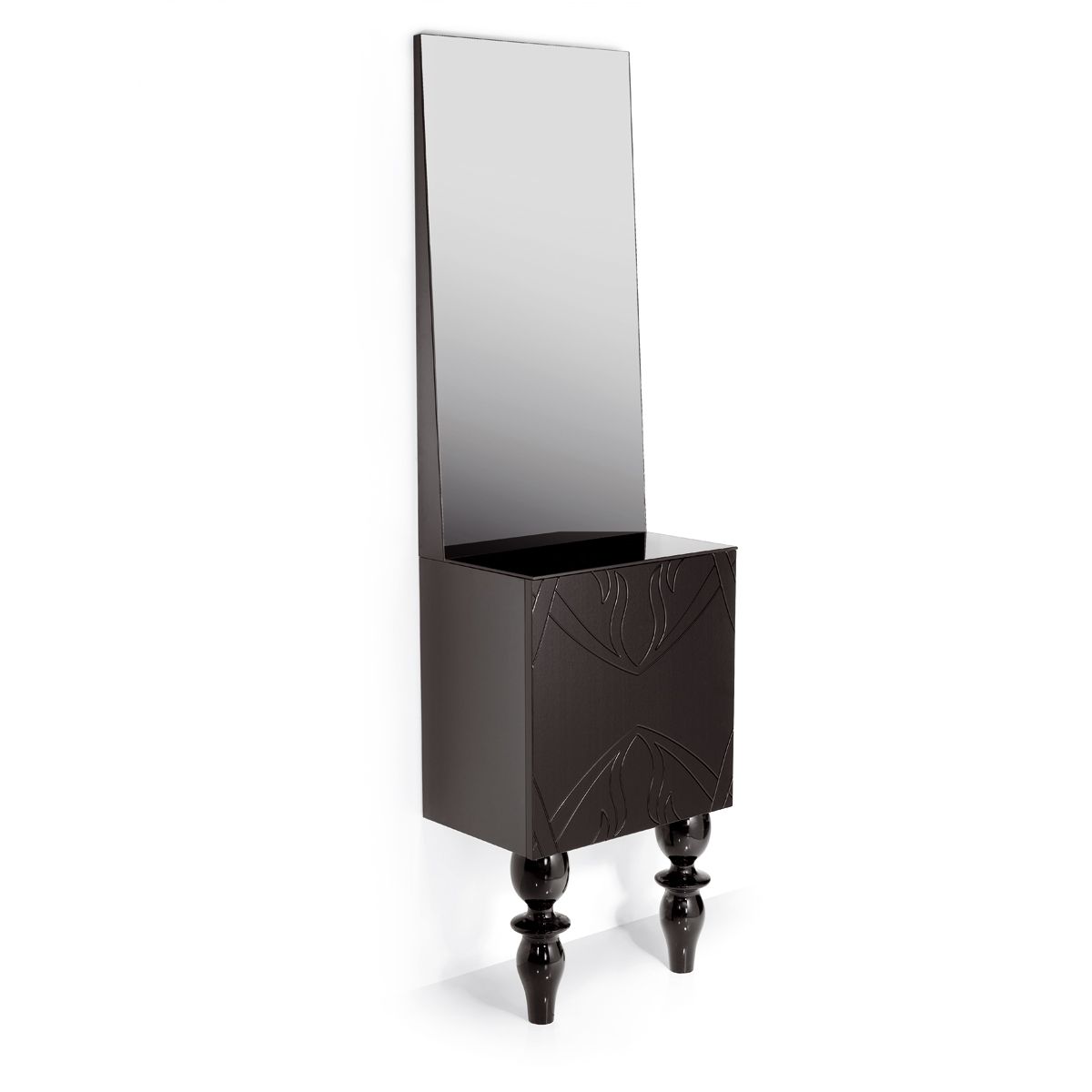 Зеркало парикмахерское "Style 84" - корпус тумбы выполнен из глянцевого акрила черного или белого цвета с рисунком. Тумба оснащена резными ножками. Крепление к стене.